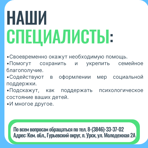 По всем интересующим вопросам вы можете обратиться по телефону: 8 (38462) 33702.Вас проконсультирует специалист по социальной работе отделения профилактики социального сиротства и семейного неблагополучия – Зубанова Надежда Николаевна.