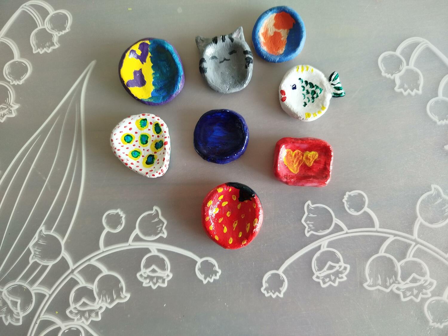 Женщины изготовили камни из полимерной глины, придумали рисунок, нанесли его на поверхность своих камней и покрыли специальным быстросохнущим лаком.